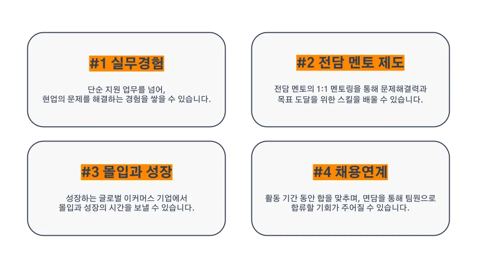 인턴들의 성장을 돕기 위해 치열하게 고민하며, 특히 현직자와의 협업, 실무 투입을 통해서 학교에서는 배울 수 없는 것들을 경험할 수 있는 시간과 경험을 제공합니다.
